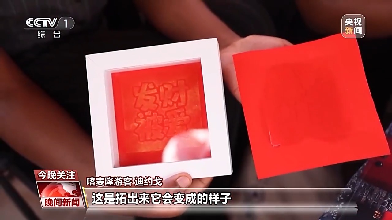 喀麦隆游客 迪约戈:这个是我正在做的,拓印发财被爱四个字,这是拓出来以后的样子,我一直对中国的文化很感兴趣,通过这个我可以学到更多中国的文化。