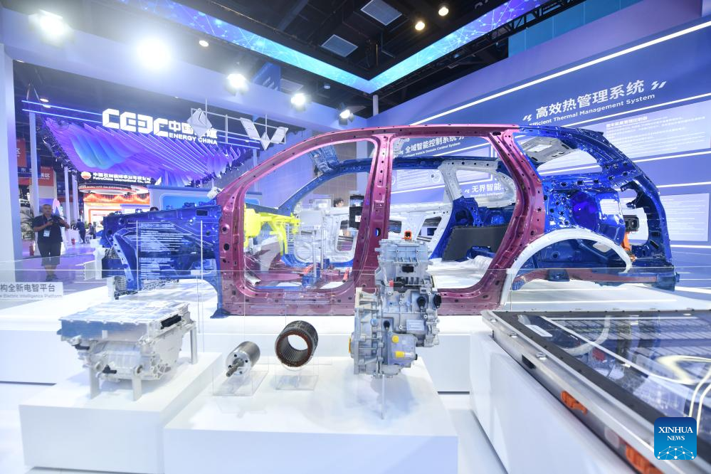 This photo taken on Sept. 20, 2025 shows a booth displaying new energy vehicle produced in Liuzhou during the 22nd China-ASEAN Expo in Nanning, south China's Guangxi Zhuang Autonomous Region. [Photo/Xinhua]