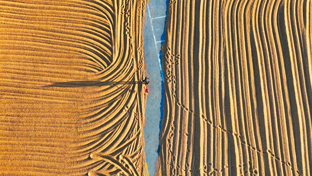 ↑2025年10月11日,农民在湖南省常宁市兰江乡晾晒稻谷。(无人机照片)CICPHOTO/周秀鱼春 摄
