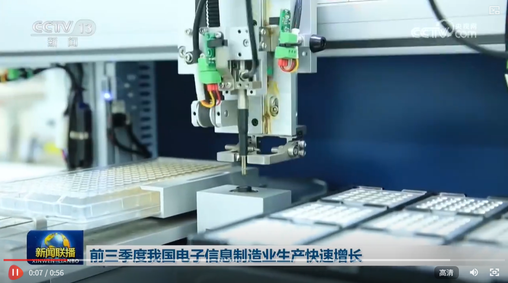 央视网消息(新闻联播):记者从工业和信息化部了解到,今年前三季度,我国电子信息制造业生产快速增长,出口保持平稳,效益平稳增长。今年以来,以电子信息制造业为核心的信息产业加速布局,从智能终端到核心元器件,产业持续发力、根基不断夯实。前三季度,规模以上电子信息制造业增加值同比增长10.9%,增速分别比同期工业、高技术制造业高4.7个和1.3个百分点。规模以上电子信息制造业实现营业收入12.5万亿元,同比增长8.8%,利润同比增长12%。出口方面,前三季度,规模以上电子信息制造业累计实现出口交货值同比增长2.1%。我国电子信息制造业的核心竞争力持续加强。