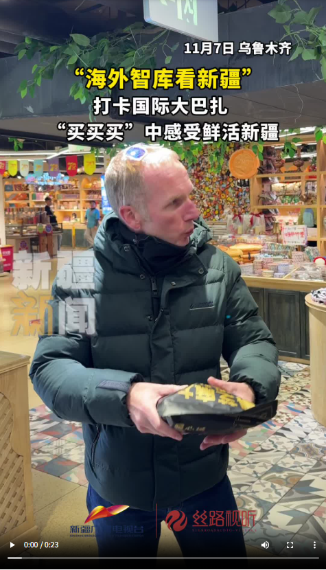 新疆广播电视台/丝路视听讯 (记者:里纳特 )11月7日,“海外智库看新疆”专家学者到访新疆国际大巴扎。他们沉浸于传统与现代交织的独特风情,在“逛”与“买”的亲身体验里,感受新疆多元文化魅力与蓬勃生机。