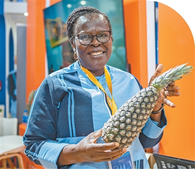 在第八届进博会国家综合展上,贝宁国家馆的工作人员展示贝宁奶油菠萝。王 初摄(人民视觉)