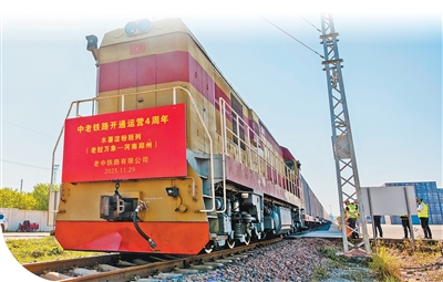 11月29日,一列满载1000吨木薯淀粉的铁路集装箱班列从中老铁路万象南站驶出,准备发往河南郑州。这是老挝首次成列运输输华的木薯淀粉。凯 乔摄(新华社发)