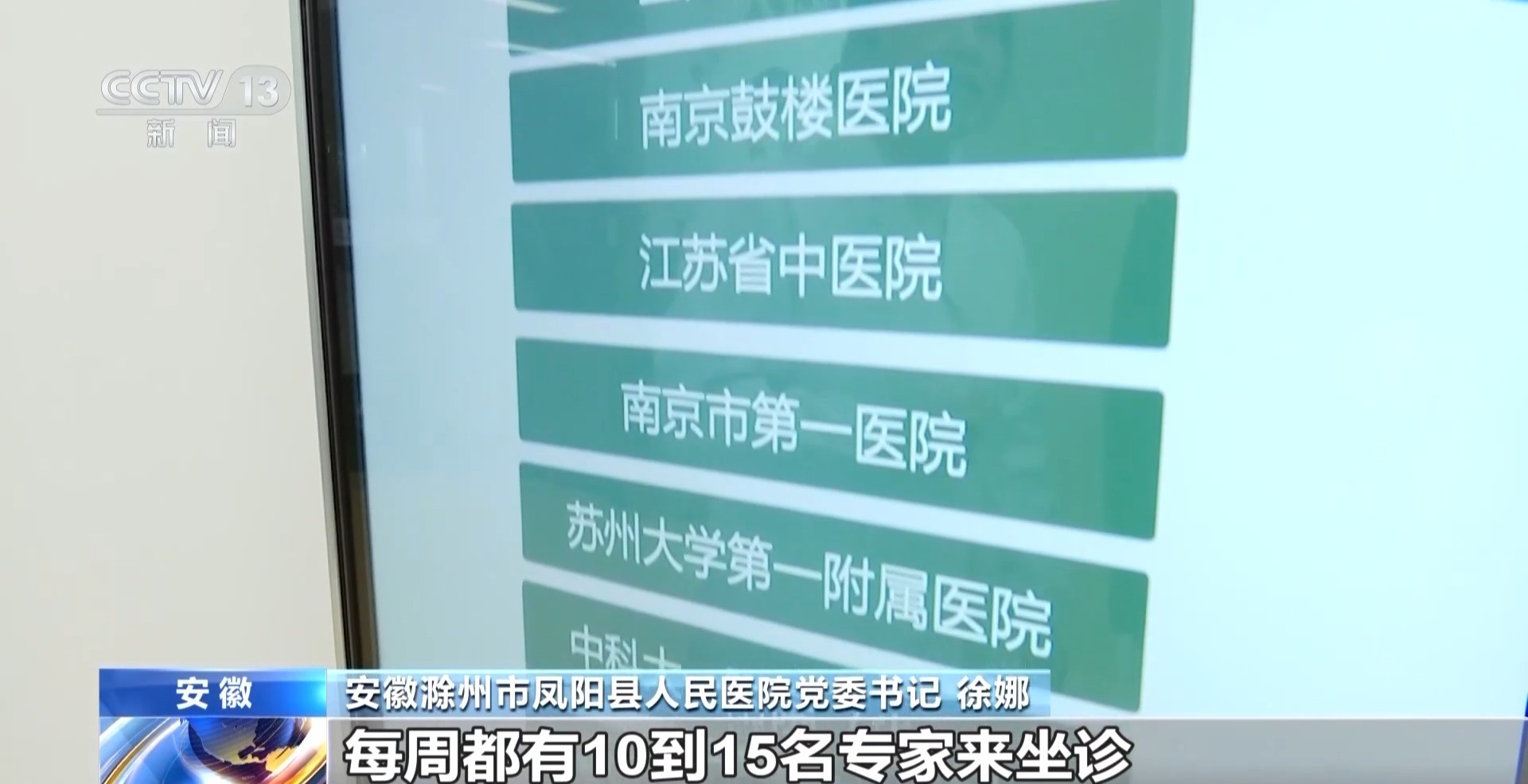 安徽滁州市凤阳县人民医院党委书记 徐娜:我们目前已有18个科室对外合作,每周都有10名到15名专家来坐诊。