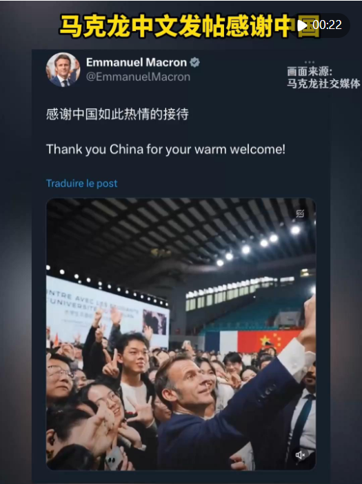 马克龙还在帖文中附上了一条时长约1分钟的视频,展现他此次访华的精彩瞬间