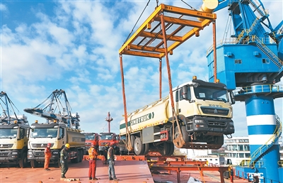 十二月八日,国产卡车在山东港口烟台港装船出口。