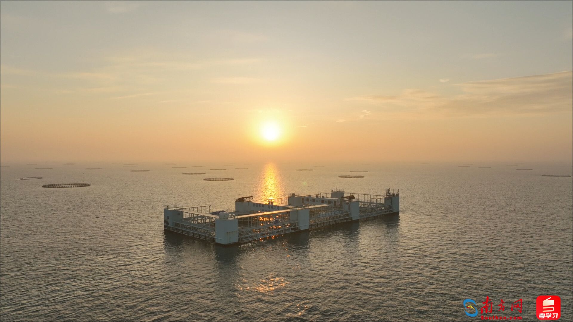 清晨七点,湛江流沙湾附近的海面还沉浸在金橙色的晨曦中。黄建斌已经起身,开启在“海威2号”深远海养殖平台上的新一天工作。这个长86米、宽32米的钢铁平台静静泊在离岸数海里的深水区,犹如一座浮动的“海上堡垒”。平台下方,深达13米的养殖水体中,金鲳鱼群正缓缓苏醒。