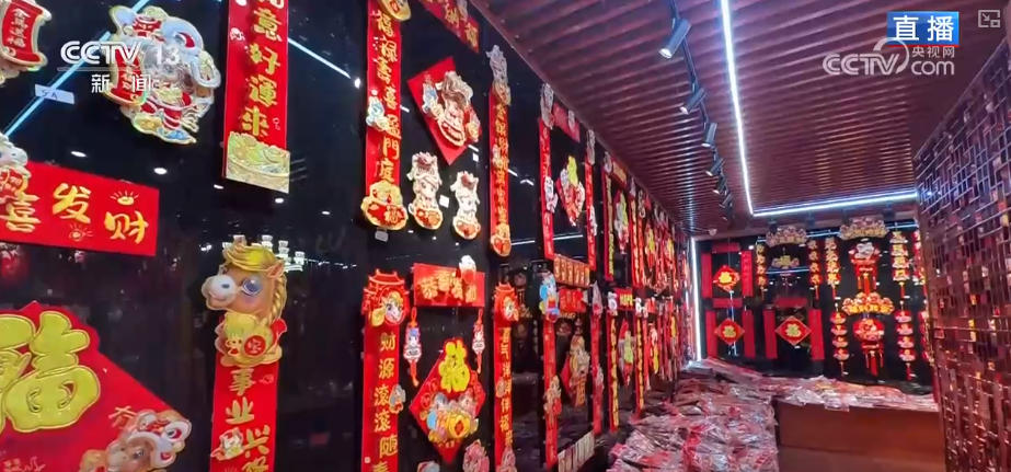 这里是商贸城的一区,这家店铺变化特别明显,半年前记者来的时候,这里还摆满了出口国外的节日用品。而现在,店里完全是另一番景象,放眼望去,满满的都是中国人自己过春节会用到的各种精美礼品和装饰。