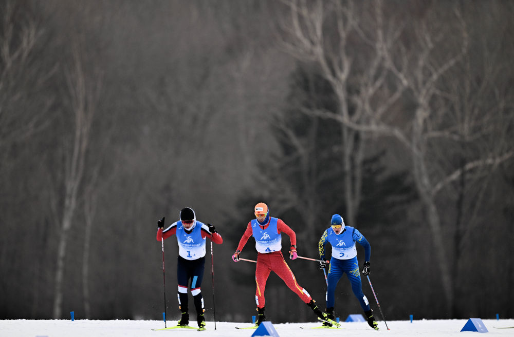 ↑2月12日,中国队选手王强(中)在第九届亚冬会越野滑雪男子4x7.5公里接力决赛中。最终,中国队获得冠军。新华社记者 伍志尊 摄