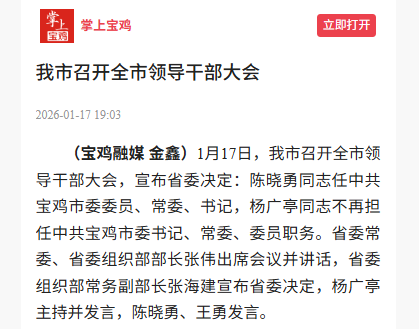 据宝鸡融媒消息,1月17日,宝鸡市召开全市领导干部大会,宣布省委决定:陈晓勇同志任中共宝鸡市委委员、常委、书记,杨广亭同志不再担任中共宝鸡市委书记、常委、委员职务。