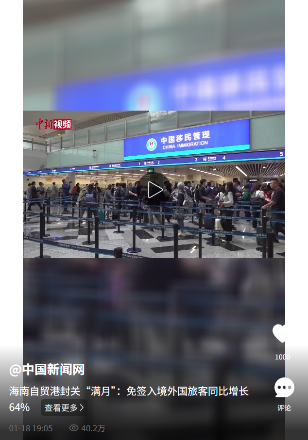1月18日,据海口出入境边防检查总站统计,自海南自贸港全岛封关以来,海口出入境边防检查总站共查验入出境外国人18.6万人次,同比增长46%;检查出入境交通工具2500余架(艘)次,同比增加27%。其中,免签入境海南的外国旅客8.7万人次,同比增长64%,占同期入境外国旅客总数的93%,免签已成为外国旅客来海南的主要入境方式。(记者 李宇凡)