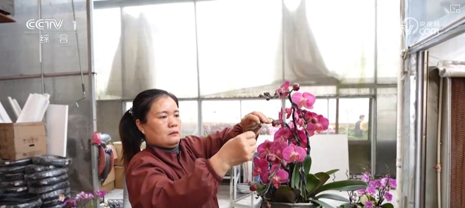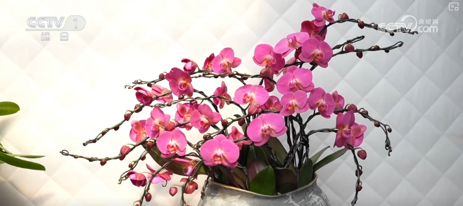 这是花艺师从众多蝴蝶兰中,挑选出枝干挺韧的株型作为“骨架”,再用手工慢慢牵引、固定而成。除了蝴蝶兰组合的奔马造型,花枝飘逸的祥云造型,花开成树的罗汉松造型,都深受市场欢迎。