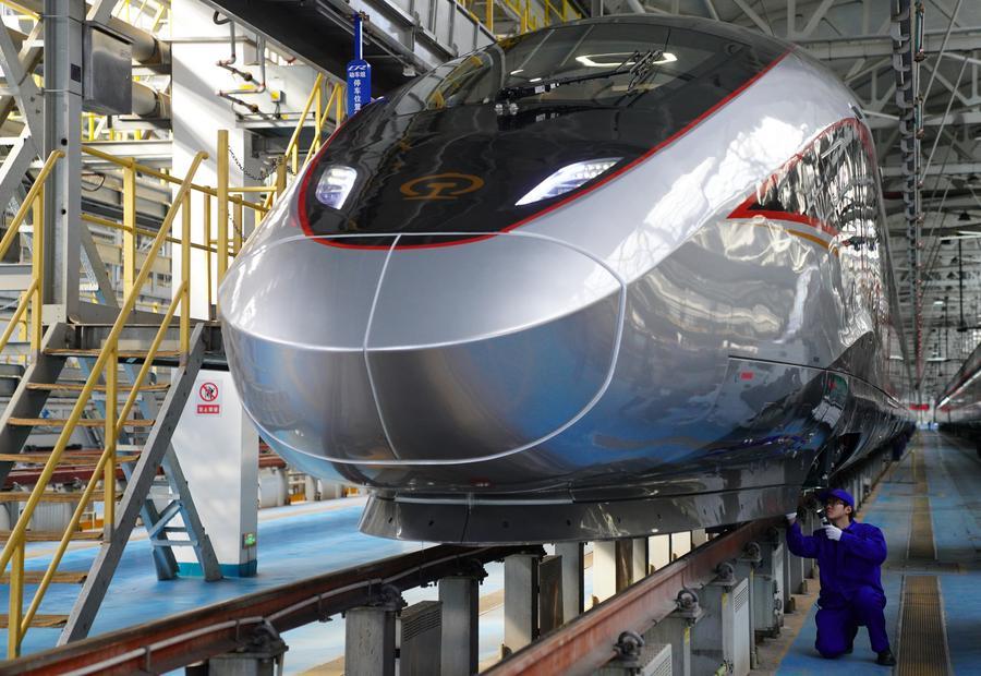 A staff member conducts maintenance work at a high-speed train base in Beijing, capital of China, Jan. 20, 2026. (Xinhua/Li An)