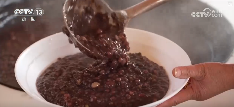 在南京溧水焦赞石村,村民们支起大锅,将糯米、红豆、红枣等食材进行熬煮,一碗碗滚烫的腊八粥免费分发给市民和游客。