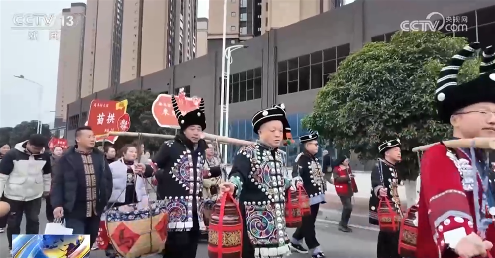 在贵州省都匀市思源社区,大家齐聚一堂,摆上拦门酒、跳起竹竿舞、共享刨汤宴,年味十足。