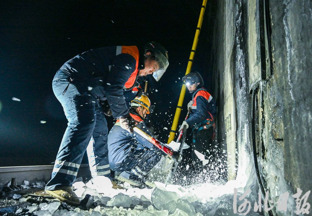 为守住安全防线,秦皇岛工务段桥梁车间的桥梁工们每到冬季便紧盯隧道结冰动态,及时对结冰部位开展除冰作业。为此,他们打趣地称自己为“打冰人”。