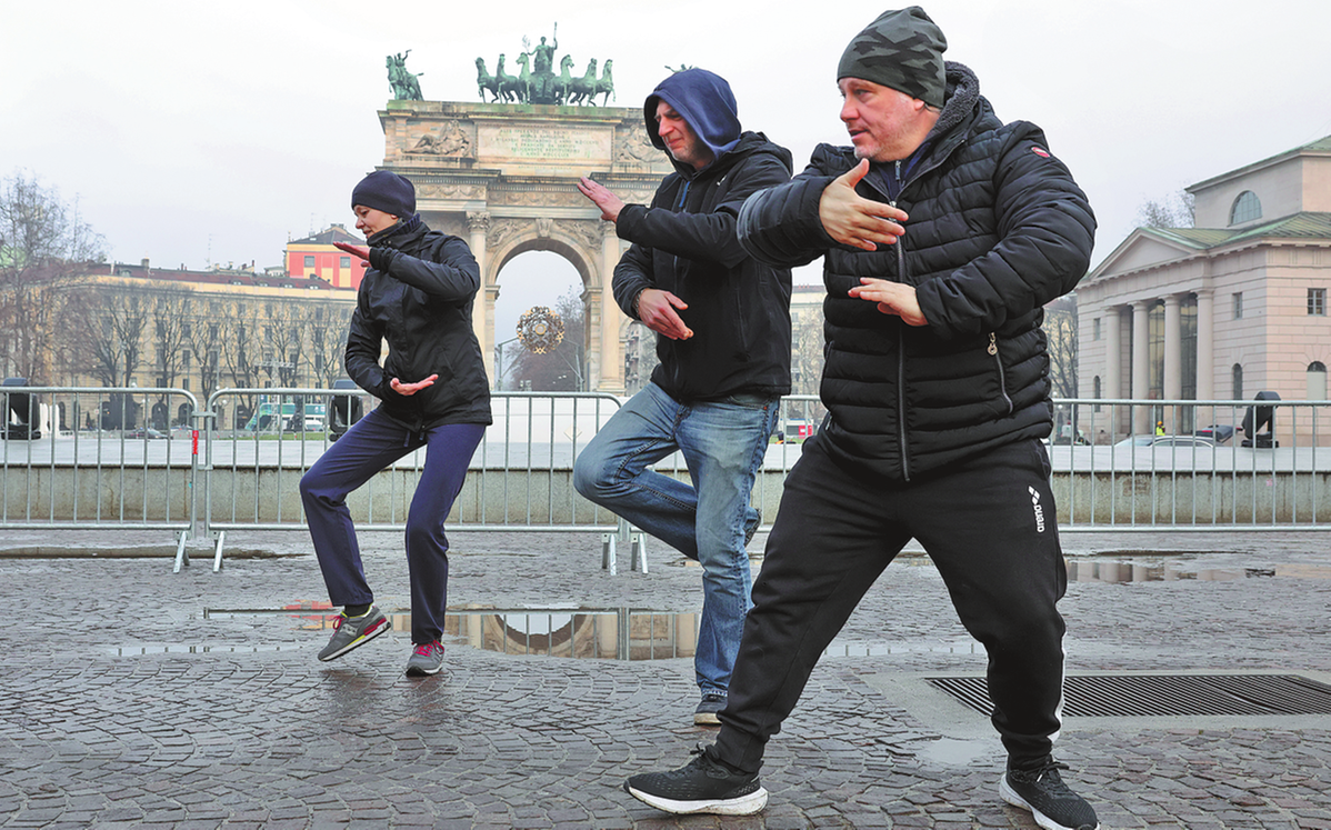 Fabrizio (right), a local resident who has visited China five times and is a lover of traditional Chinese culture, practices tai chi with friends near the main cauldron of the Milano-Cortina 2026 Winter Olympics at Arco della Pace in Milan. WEI XIAOHAO/CHINA DAILY