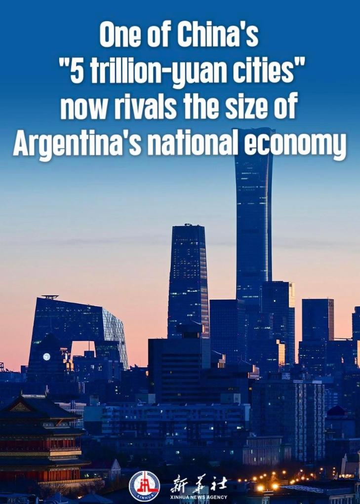 Beijing and Shanghai have each recorded GDP exceeding 5 trillion yuan (about 720 billion dollars), roughly equivalent to the size of Argentina's economy, highlighting the substantial gains from China's urbanization, industrial clustering and high-quality development.