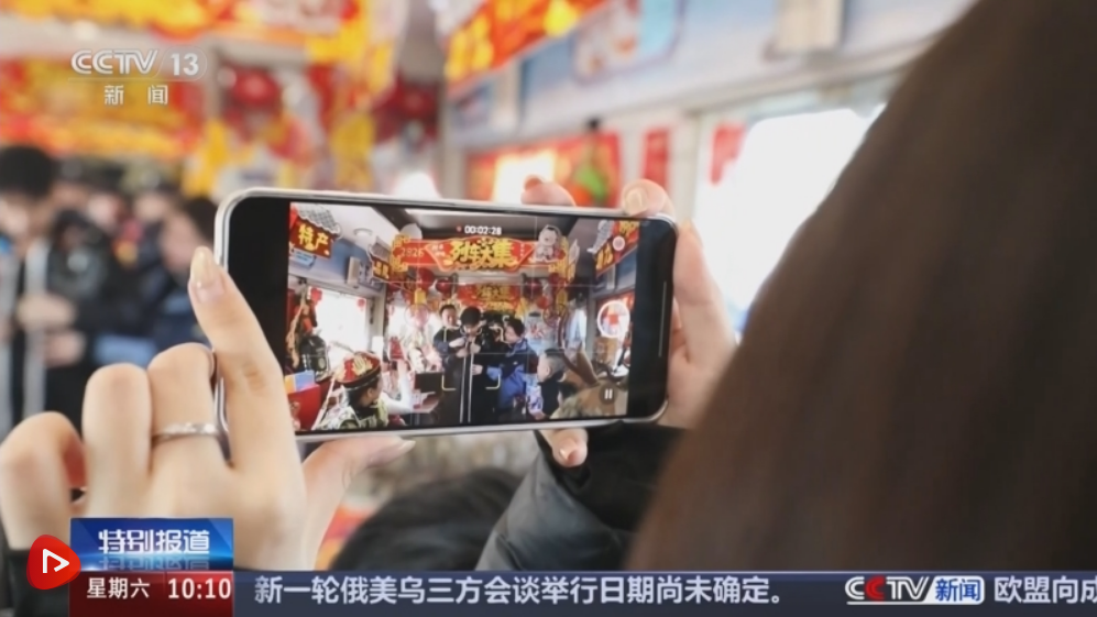 车厢内,火红的灯笼和憨态可掬的年画娃娃,烘托出热烈的东北年味儿。煎饼、冻梨汁等特产琳琅满目,车厢里洋溢着赶大集般的喜悦。此次“列车大集”还邀请乡村干部现场介绍卖货,旅客可以品尝、扫码下单,实现“车上购买、快递到家”的消费体验。
