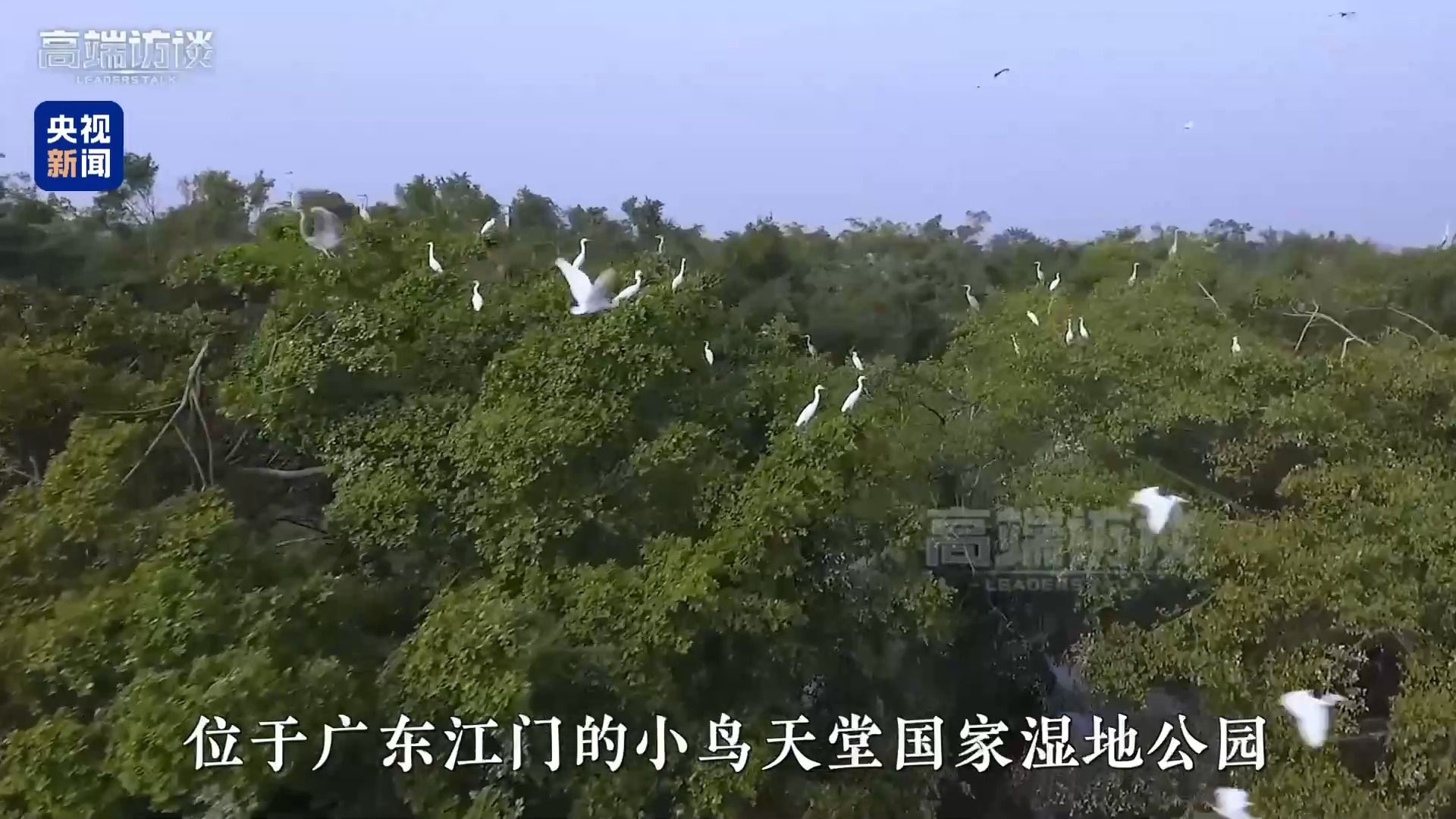 总台记者 邹韵:小伙伴们,快看看这个语文书的封皮,是不是开心的记忆“嗖”的就回来了!再顺着我的手往这看啊,《鸟的天堂》,这是巴金先生在1933年创作的一篇散文。这篇文章被选入到了语文课本当中,所以可能很多像我这么大的孩子都是读着这篇课文长大的。今天我们来到了位于广东江门的小鸟天堂国家湿地公园,站在这欣赏这样的美景,真的觉得课文里的场景照进了现实。400多年前,有一棵榕树在这里生根,如今已经繁衍成了万鸟栖息的生态奇观。今天我们来到这里,是来见一位我们《高端访谈》的老朋友。