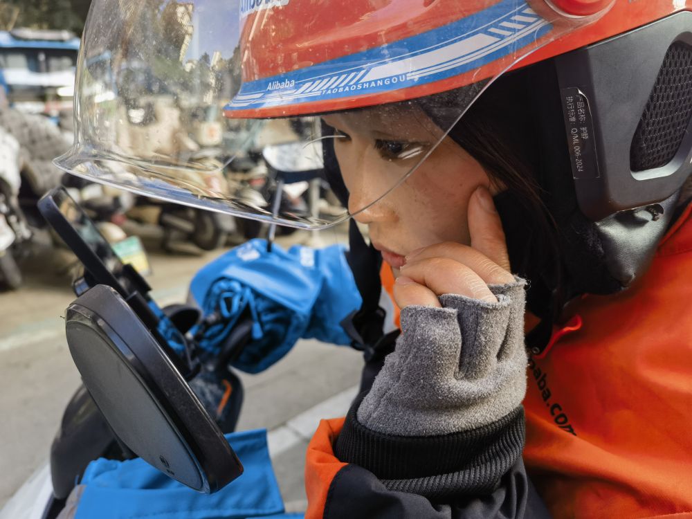外卖骑手朱亭亭在查看雨雪天气送餐时脸上摔出的伤。新华社记者 朱青 摄