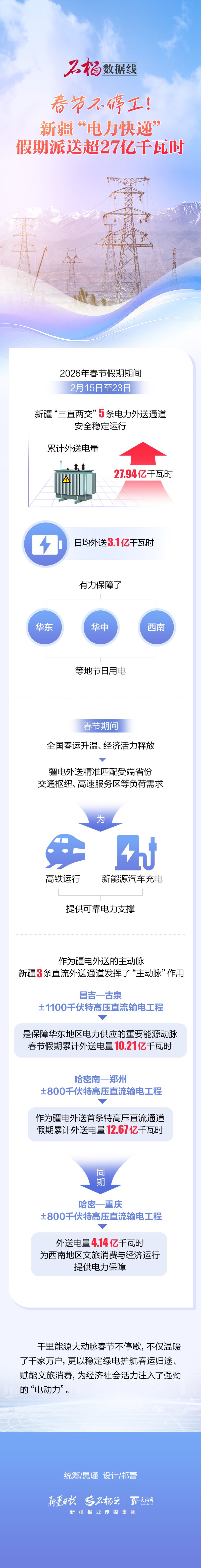 2026年春节假期期间(2月15日至23日),新疆“三直两交”5条电力外送通道安全稳定运行,累计外送电量27.94亿千瓦时,日均外送3.1亿千瓦时,有力保障了华东、华中、西南等地节日用电。