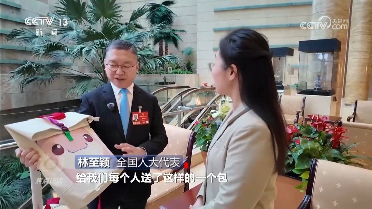 在代表团驻地,一见到来自粤港澳大湾区的全国人大代表林至颖,他的背包就引起了记者的注意。