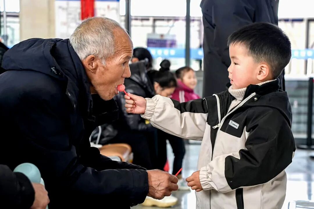 候车大厅里,时光仿佛在此慢了下来。一个小男孩踮着脚,小心翼翼地将棒棒糖剥开送进爷爷嘴里。这份纯粹的亲昵,让回家的路从一颗糖的甜蜜开始。