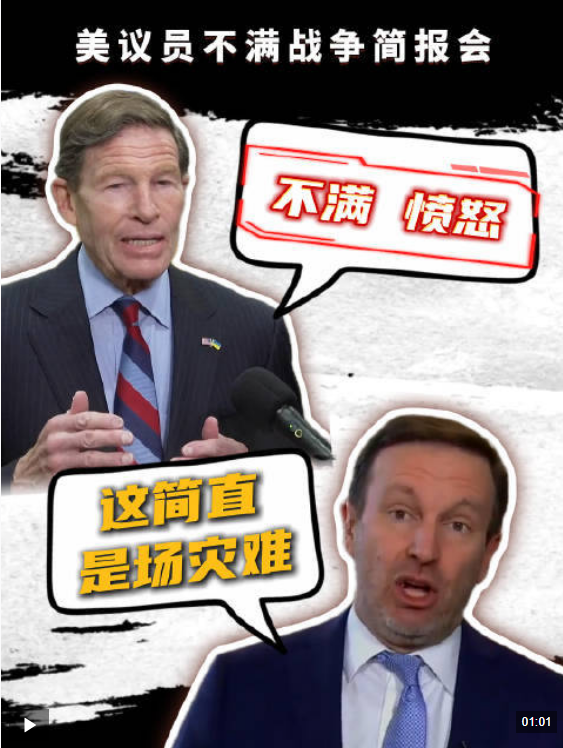 民主党参议员墨菲则直言,简报会证实“这场战争完全缺乏逻辑性”,不可能实现任何目标,“简直是场灾难”。