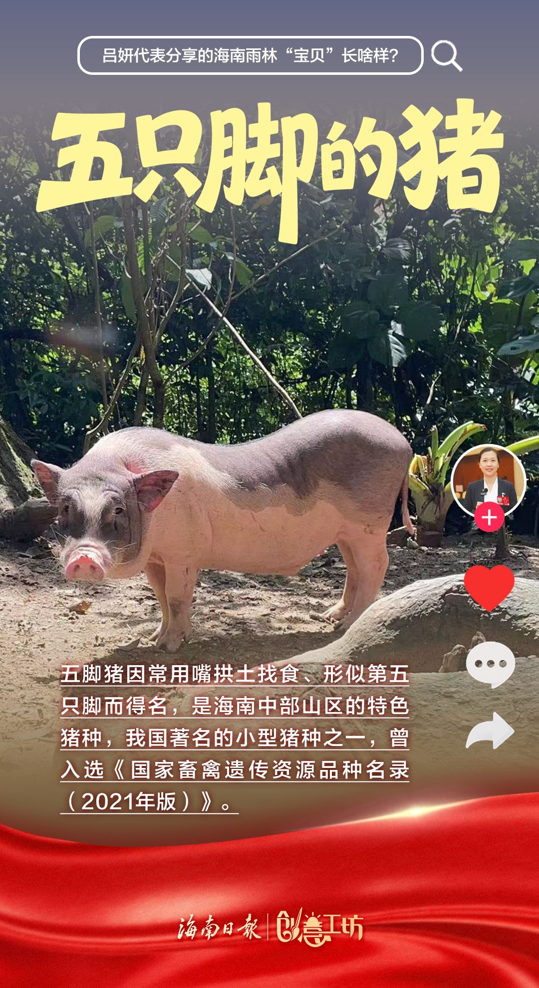 全国人大代表,海南省保亭黎族苗族自治县委常委、副县长吕妍走上“代表通道”,向全国人民分享了海南雨林“宝贝”——能煲汤的五指毛桃、能做药的益智、会上树的鸡、不回家的牛、会冲浪的鱼、五只脚的猪