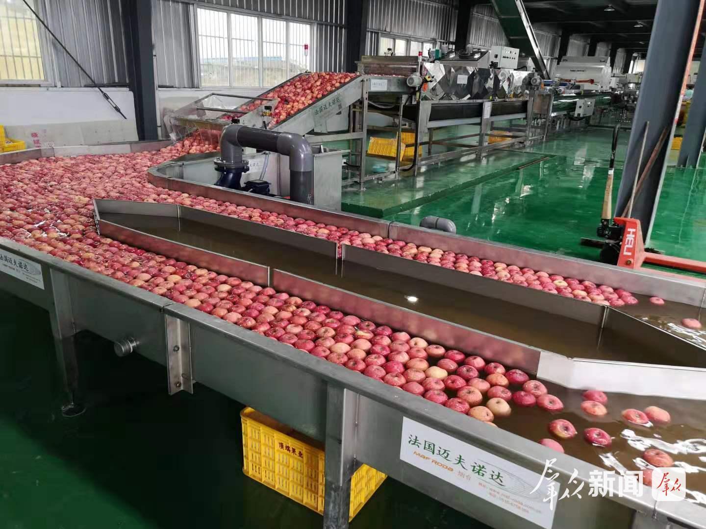 图为陕西顶端果业科技有限公司的智能分选车间内,智能分选线正在进行苹果漂洗。