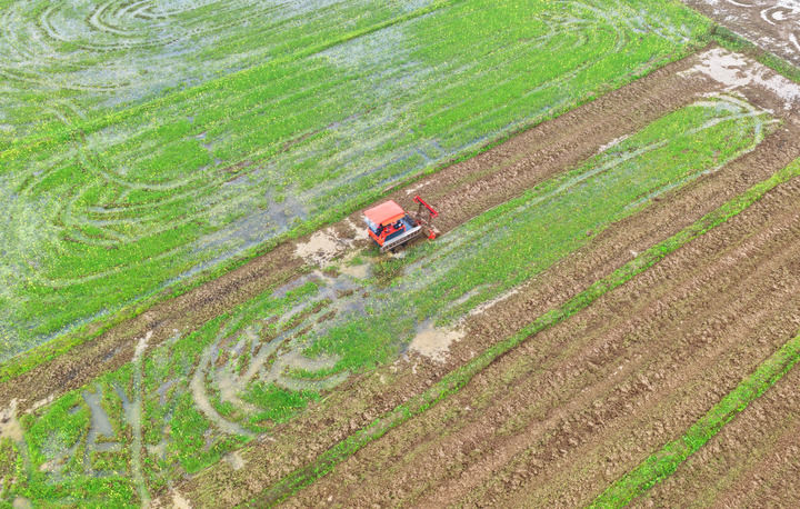 2026年3月20日,在湖南省衡阳市祁东县金桥镇,村民驾驶农机翻耕稻田(无人机照片)。新华社发(曹正平摄)