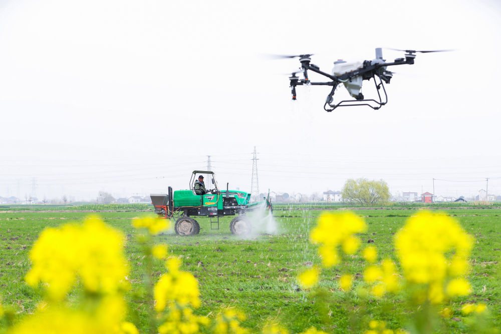 3月13日,在江苏省兴化市陈堡镇蒋庄村,农民驾驶植保无人机、自走式喷杆喷雾机实施杂草防治作业。新华社发