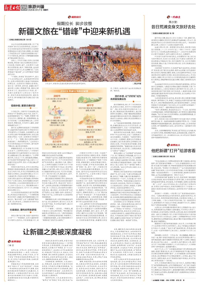 “不调休,多休假”的民间呼声,道出了大众对舒适出行、品质旅游的热切向往,也预示着我国假日旅游市场将迎来结构优化、出游时间分散的全新格局。面对这一新形势、新机遇,新疆文旅行业如何主动跟上假期新节奏,精准对接游客多元化、高品质的出行需求,进一步激活消费潜力?记者采访了业内专家、景区代表及民宿经营者等,倾听各方声音,探寻新疆文旅的适配之道与发展路径。