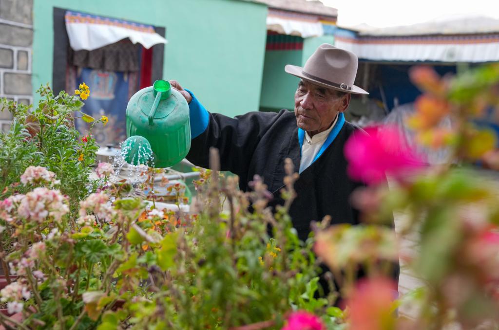 达瓦片多在自家院子给花浇水(晋美多吉 摄)