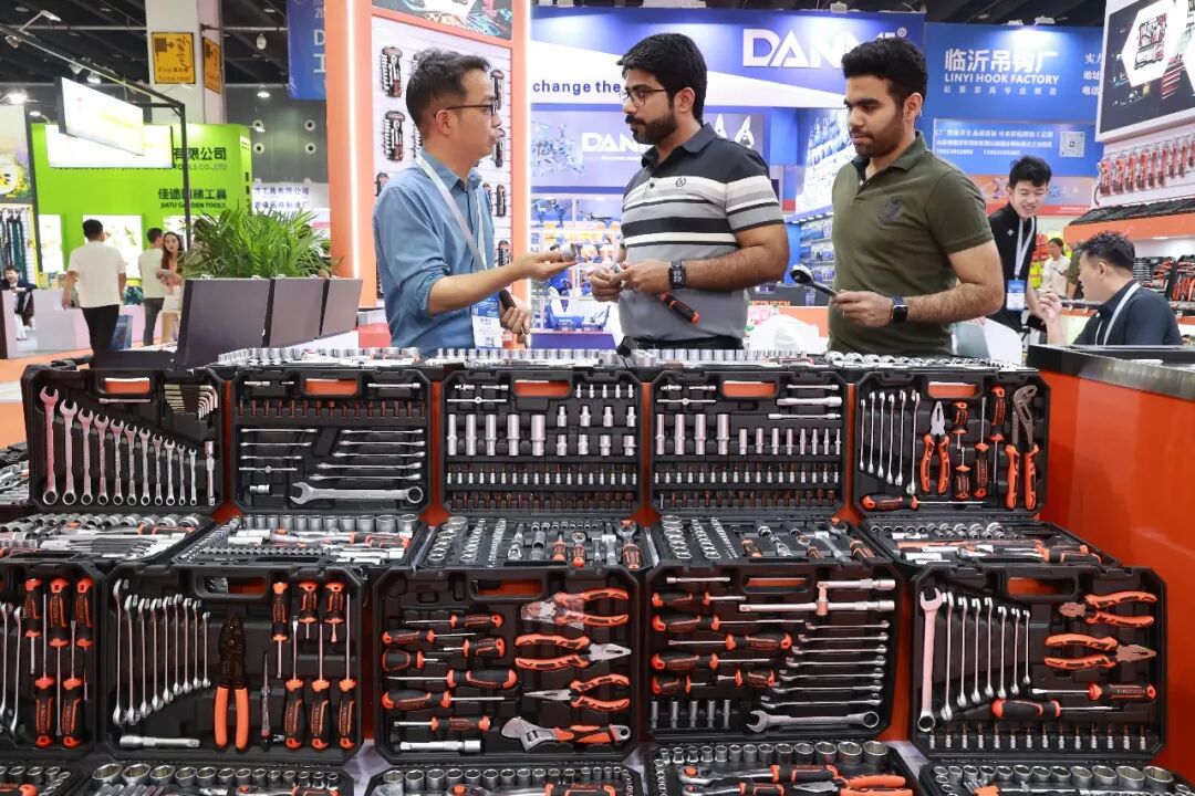 4月20日,浙江义乌,外商在第10届中国义乌国际五金电器博览会上采购五金工具产品。潘秋亚摄