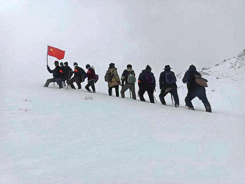 次仁罗布(左二)和村里的固边队员在巡边路上(2024 年 2 月摄) 受访者供图