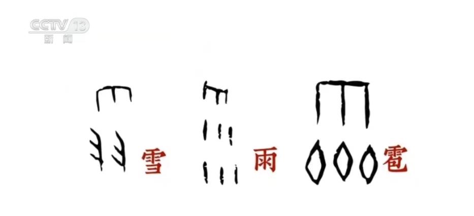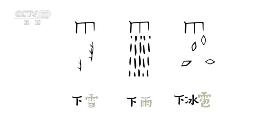 先来看一组网友用甲骨文做成的动态表情包,您来猜猜这些是什么意思?这分别是下雪、下雨和下冰雹。而雪、雨、雹这三个字的甲骨文写法分别是这样的……是不是特别形象?