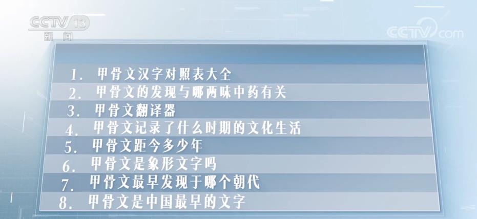 而“甲骨文”流量激增的背后,网友们对甲骨文的关注点也在变化。从过去最爱搜索“甲骨文距今多少年”“甲骨文记录了什么时期的文化生活”这样的入门级问题,逐渐变成了如何认识甲骨文这样的专业问题,也正因如此,“甲骨文汉字对照表”成为了甲骨文相关内容中,搜索热度的第一名。