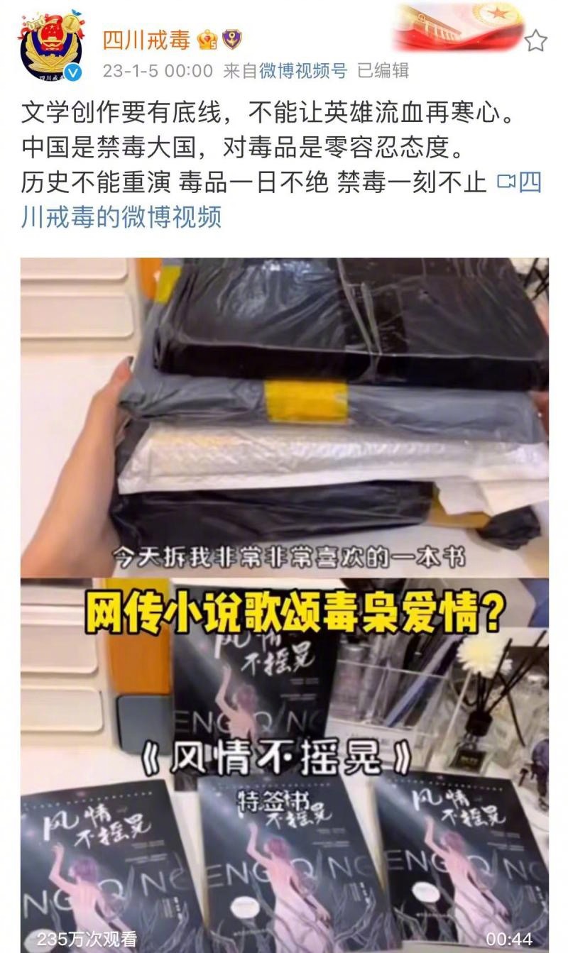 四川省戒毒管理局表示,中国对毒品是零容忍的态度,中国是世界上列管毒品最多、管制最严的国家。和平年代,缉毒警察是最具风险的警种之一,面对暴戾的毒贩,每一次抓捕都以命相搏。2017年以来,全国有30余名禁毒民警牺牲,60余名禁毒民警负伤。呼吁抵制“毒”小说,致敬英勇的禁毒英雄。“你之所以看不见黑暗,是因为无数勇敢的人把黑暗挡在你看不见的地方。”