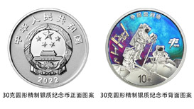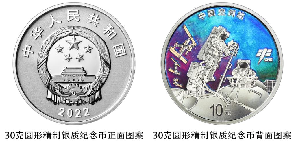 30克圆形银质纪念币背面图案为中国航天员在中国空间站舱外活动场景,辅以中国载人航天工程“三步走”发展战略示意图、中国载人航天工程官方标志等组合设计,并刊“中国空间站”字样及面额。