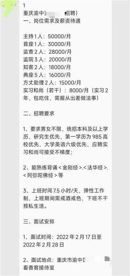 记者在重庆市民文先生提供的招聘信息截图上看到,该寺院招聘住持1名,月薪5万。此外,还招聘首座、监查、监院、知客、典座、方丈助理、实习和尚等,待遇从3万元至0.8万元不等。招聘信息还称,对应聘人员要求统招本科及以上学历,研究生优先,第一学历985优先……