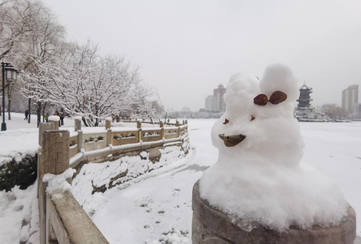 雪花纷纷扬扬,漫天飞舞,整个城市瞬时成为白茫茫的童话世界。尤其在公园内随处可见形态各异的雪人,更是增添了不少童趣。