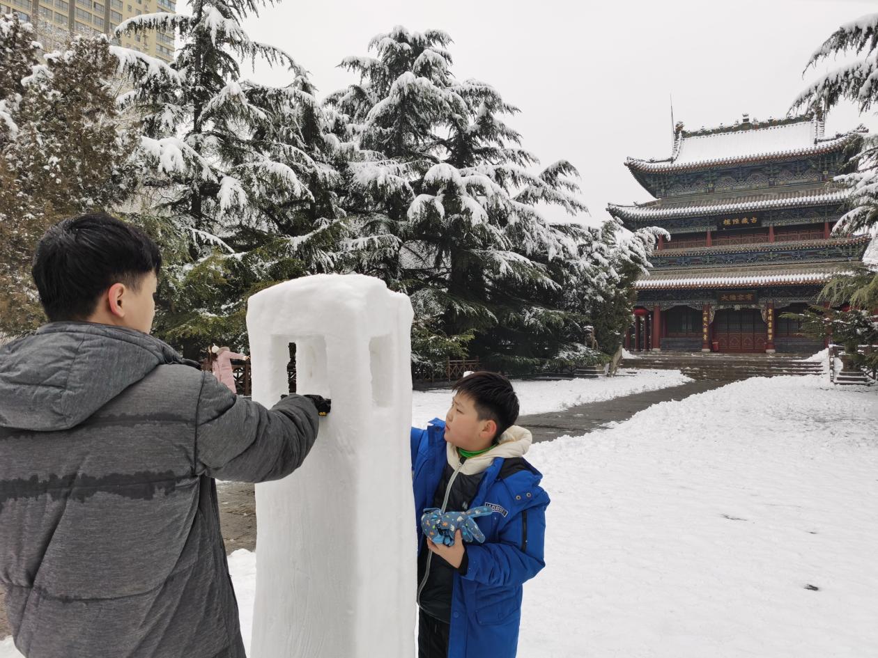 在太原市迎泽公园内的地标性建筑前,民众进行着雪雕创作。
