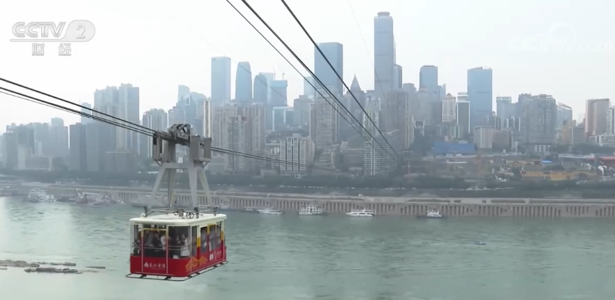 在重庆长江索道,每趟缆车都挤满了游客,等候的人也排起了长队。一位来自上海的游客带着家人来游玩,这是他们第一次到重庆旅游。