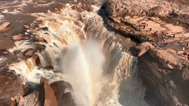 随着气温回暖,黄河开河,位于晋陕交界的壶口瀑布全面解封。奔涌而下的黄河水如万马奔腾,以排山倒海之势跃入“十里龙槽”,溅起数十米高的水雾。阳光照射下,一道亮丽的“彩虹桥”横跨咆哮的飞瀑,形成云雾迷蒙、彩虹通天的壮丽景观