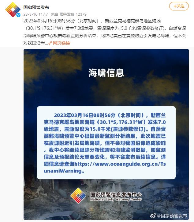 央视网消息:自然资源部海啸预警中心发布海啸信息提示:3月16日8时56分(北京时间),新西兰克马德克群岛地区海域(30.1°S,176.31°W)发生7.0级地震,震源深度为15.0千米。自然资源部海啸预警中心根据最新监测分析结果,此次地震已在震源附近引发局地海啸,但不会对我国沿岸造成影响。该中心将继续跟踪分析地震和海啸监测数据,如监测信息及预报结论无重要变化,将不会发布后续信息。