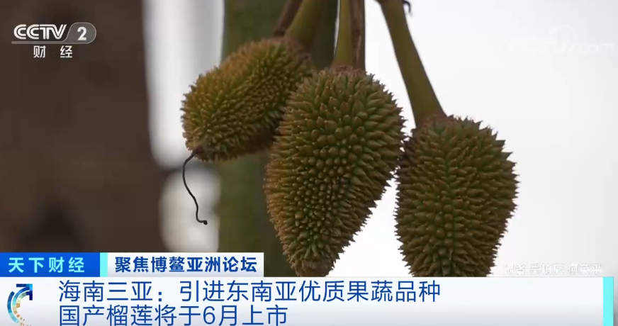 总台央视记者 吴柏辰:榴莲是一种我们耳熟能详的热带水果,但是它价格比较贵,因为它主要依赖进口。在我国进口水果总额里,榴莲是常年位居前列。可以看到我身后的这一片已经成功挂果的榴莲树,是在我国海南三亚的土地上,这就是国产榴莲,预计在今年6月份就可以进入市场了。