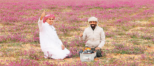 近日,在沙特阿拉伯拉夫哈,人们在薰衣草田中煮茶休闲。新华社/法新