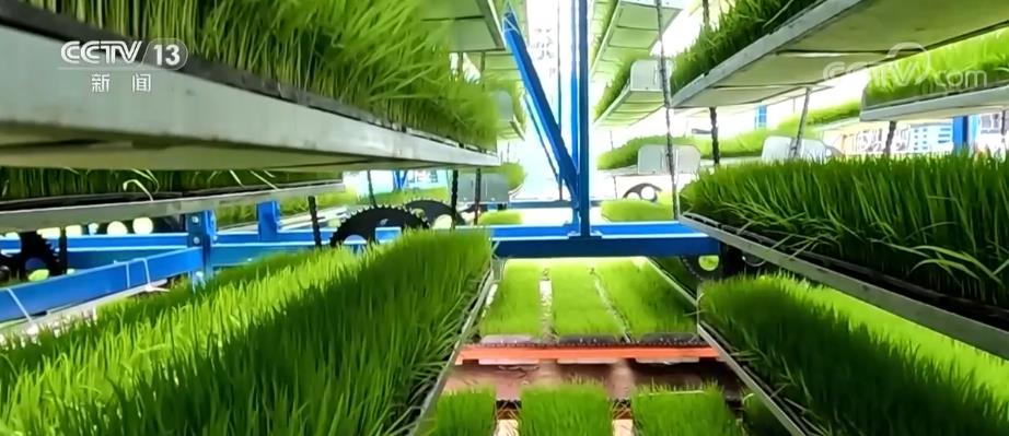 催芽成功的秧苗,就会被放到我们这7台先进的循环运动式育秧床上。育秧床是立体多层、循环运动的,通过上下齿轮的不断转动,秧苗就可以在上面进一步享受均匀光照,以及合理的空间,并且节约土地。在这样一片绿油油的秧盘上,层层叠叠的,秧苗最高的已经达到了十几厘米,而且叶片非常壮实、苗间整齐。这一批秧苗已经长到了两叶一芯,可以到达室外进行下一步的炼秧。整个育秧中心采用物联网系统进行整体控制,所有设施都纳入“一张网”管理,工作人员只需要通过手机,就可以实现远程控制秧苗所需要的温度、光照、水分和养分。现场虽然工作人员不多,但是智能化的生产线“存在感”十足。